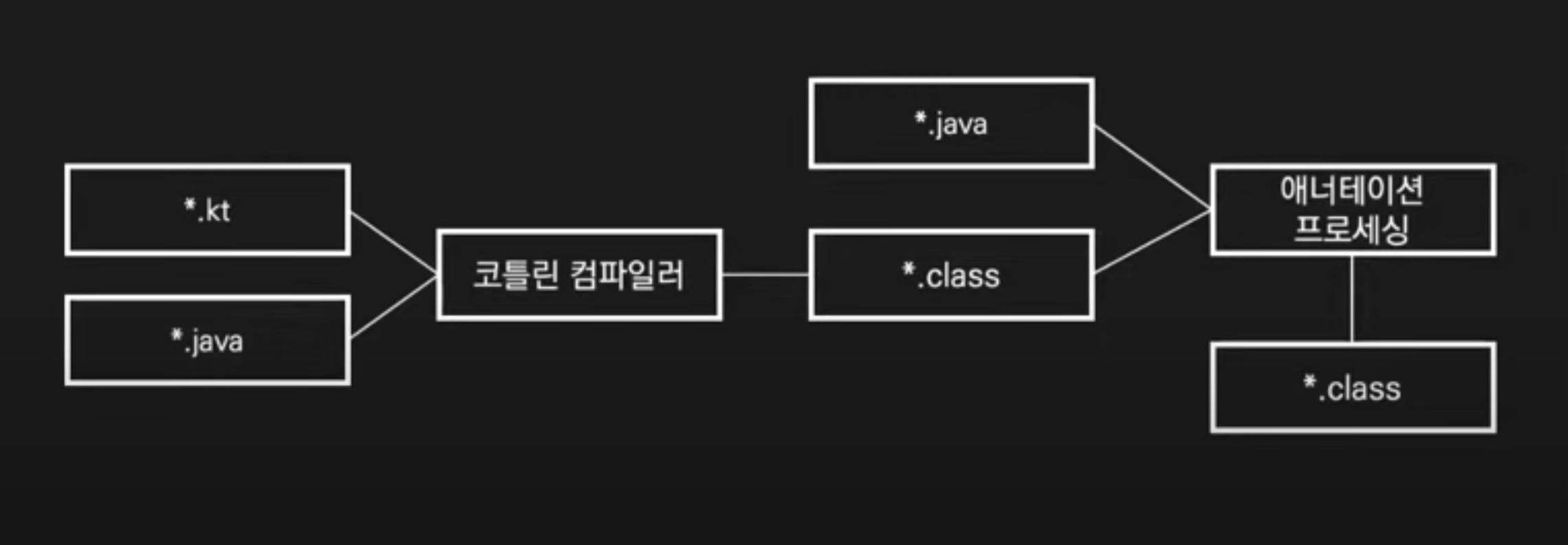 - 코틀린이 먼저 컴파일된 다음에 자바가 컴파일되는데 그 과정에서 애너테이션 프로세싱이 일어난다.