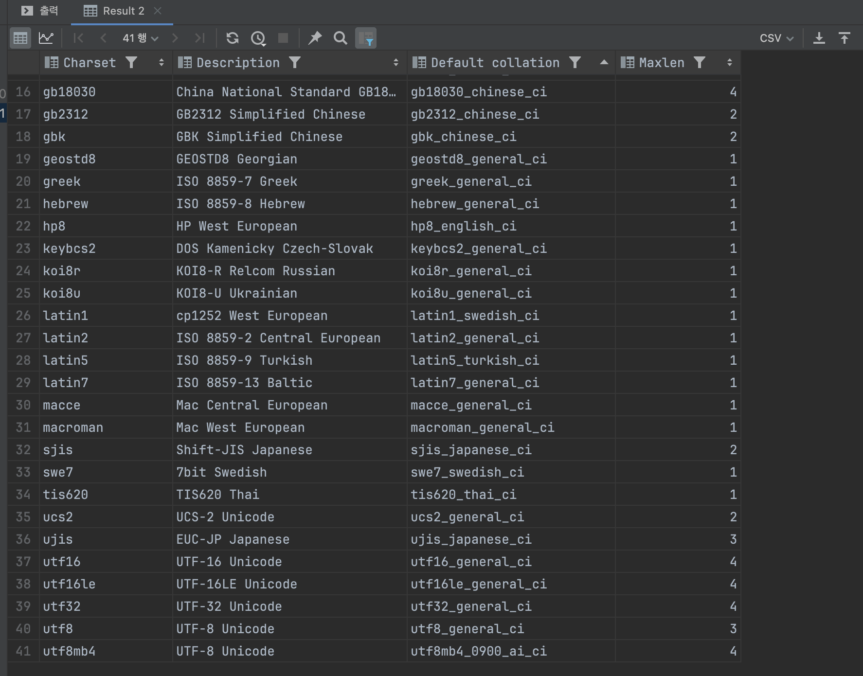 -- MySQL 서버에서 사용 가능한 문자 집합