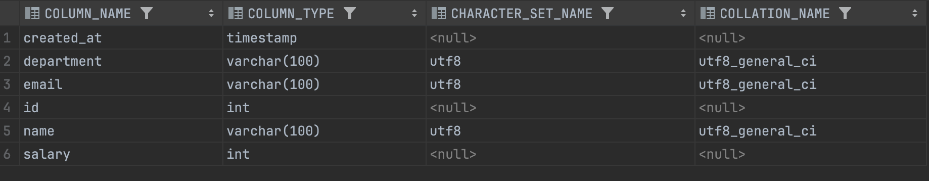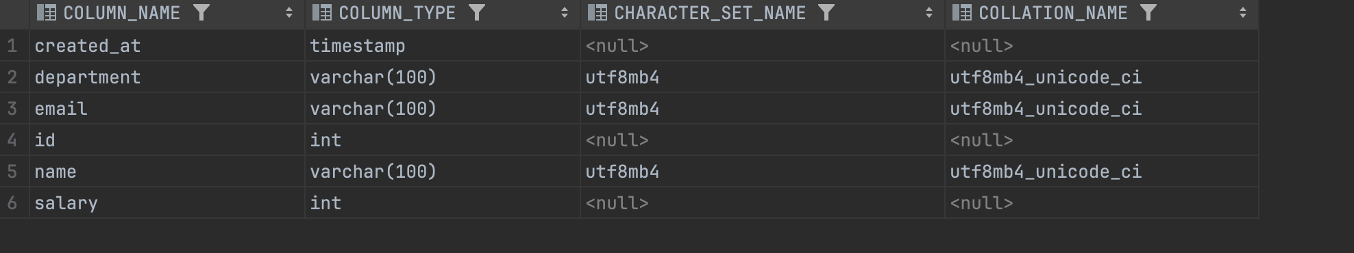 다음은 users 테이블의 예제이다. 기본 문자 집합은 utf8이고, department, email, name이라는 세 개의 문자열 컬럼이 있다.