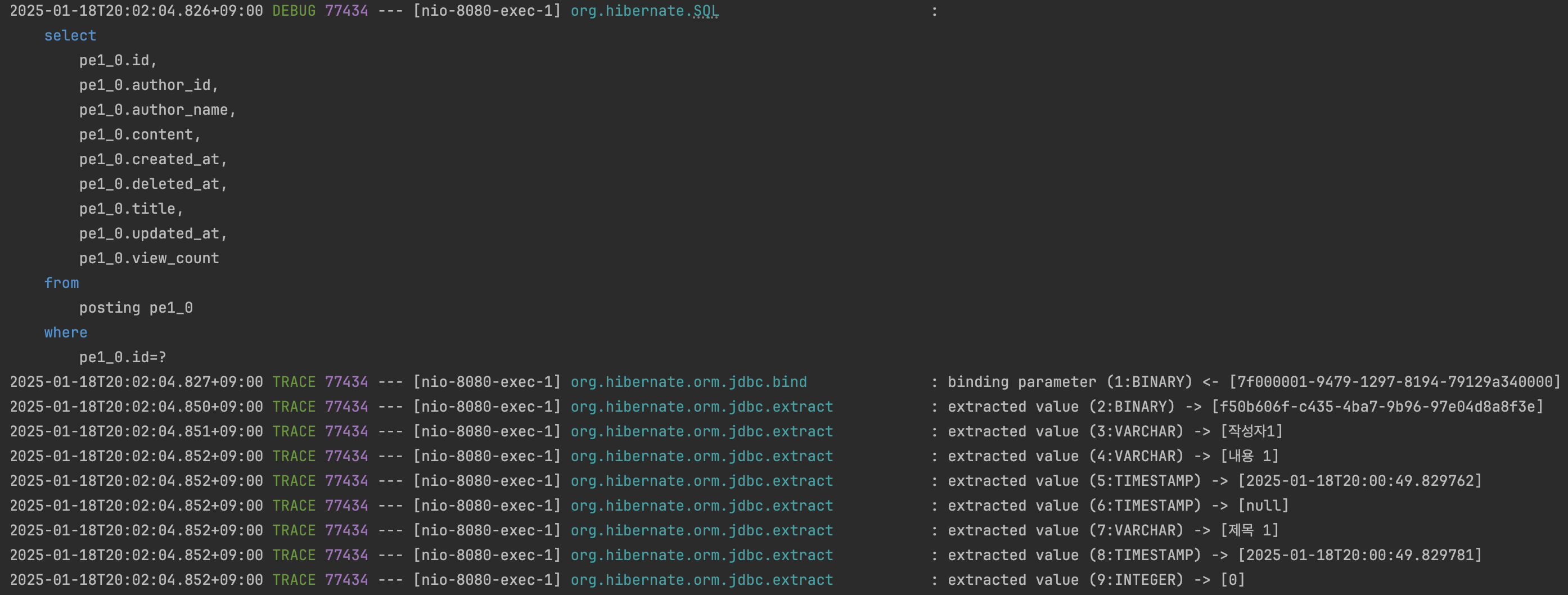 org.hibernate.orm.jdbc.bind: trace # JDBC 파라미터 바인딩 로깅