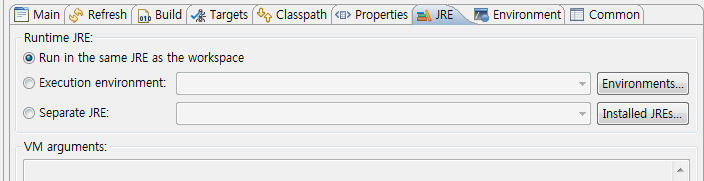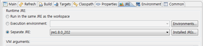 문제가 되는 Ant 빌드의 Run As> External tools configuration을 확인해보니 Separate JRE로 런타임하는 JRE가 1.8으로 설정되어있었다.